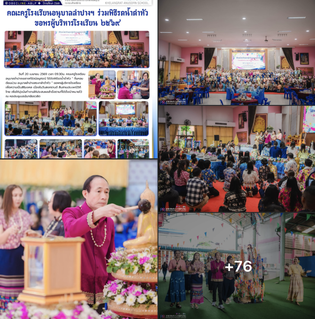 เมื่อวันที่ ๒๐ เมษายน ๒๕๖๙ เวลา ๐๙.๓๐ น. คณะครูและบุคลากรทางการศึกษา โรงเรียนอนุบาลลำปางเขลางค์รัตน์อนุสรณ์ จัดพิธีรดน้ำดำหัวและขอพรผู้บริหาร ภายใต้ชื่องาน “กิ๋นหอมต๋อมม่วน อนุบาลลำปางสระเกล้าดำหัว” โดยมี นายสุนธร ธรรมสิทธิ์ ผู้อำนวยการโรงเรียนอนุบาลลำปางเขลางค์รัตน์อนุสรณ์ พร้อมด้วยคณะผู้บริหารโรงเรียน ร่วมรับคำชำระสระเกล้าและให้พรแก่คณะครู เนื่องในเทศกาลสงกรานต์หรือวันขึ้นปีใหม่ไทย ณ หอประชุมนรนันทชัยชวลิต