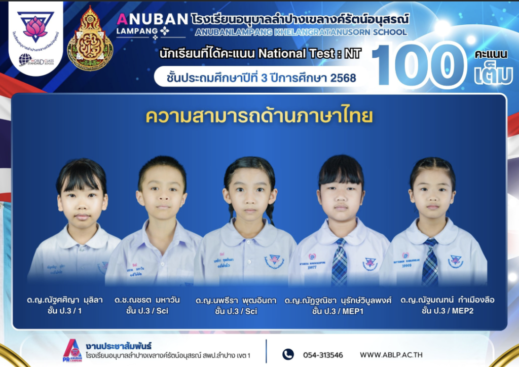โรงเรียนอนุบาลลำปางเขลางค์รัตน์อนุสรณ์ ขอประกาศเกียรติคุณและแสดงความยินดีกับนักเรียนระดับชั้นประถมศึกษาปีที่ 3 ในโอกาสที่ทำผลงานได้อย่างยอดเยี่ยมจากการทดสอบประเมินคุณภาพผู้เรียนระดับชาติ (National Test: NT) ประจำปีการศึกษา 2568 โดยสามารถคว้าคะแนนสอบ 100 คะแนนเต็ม ในด้านภาษาไทย ซึ่งสะท้อนถึงทักษะและความสามารถทางภาษาอันโดดเด่นในระดับประเทศ