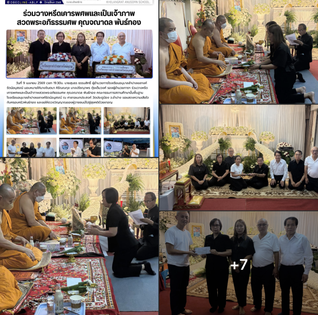 เมื่อวันที่ 9 เมษายน 2569 เวลา 19.30 น. นายสุนธร ธรรมสิทธิ์ ผู้อำนวยการโรงเรียนอนุบาลลำปางเขลางค์รัตน์อนุสรณ์ มอบหมายให้ นางจินตนา หิรัณณกุล และนางปรัชญาพร ตุ้ยเต็มวงศ์ รองผู้อำนวยการโรงเรียนฯ เป็นตัวแทนคณะครูและบุคลากรทางการศึกษา เข้าร่วมพิธีวางหรีดเคารพศพและร่วมเป็นเจ้าภาพในพิธีสวดพระอภิธรรมศพ คุณจณาดล พันธ์ทอง คณะกรรมการสถานศึกษาขั้นพื้นฐาน โรงเรียนอนุบาลลำปางเขลางค์รัตน์อนุสรณ์ ณ ศาลาอเนกประสงค์ วัดประตูป่อง จังหวัดลำปาง