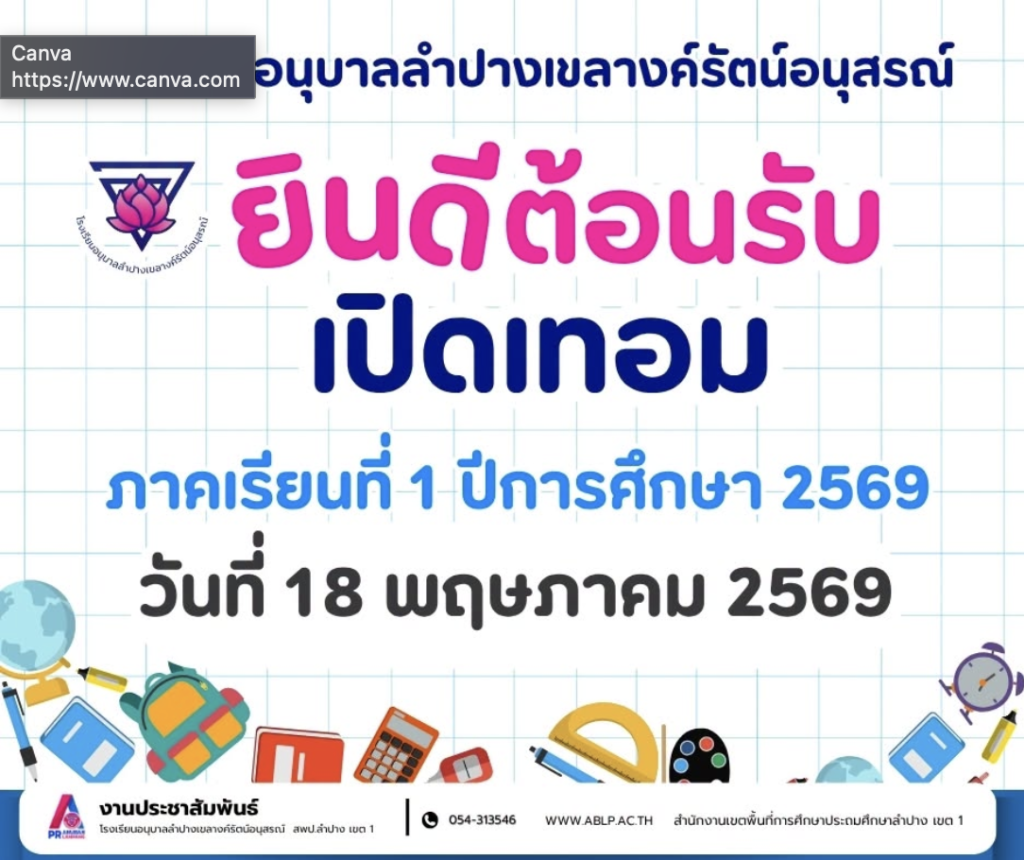 โรงเรียนอนุบาลลำปางเขลางค์รัตน์อนุสรณ์ ขอแจ้งประชาสัมพันธ์กำหนดการเปิดภาคเรียน ประจำปีการศึกษา ๒๕๖๙ เพื่อเตรียมความพร้อมให้นักเรียนและผู้ปกครองสำหรับการเข้าสู่รั้วโรงเรียนอีกครั้ง โดยมีกำหนดการเปิดภาคเรียนที่ ๑ ในวันจันทร์ที่ ๑๘ พฤษภาคม ๒๕๖๙ นี้