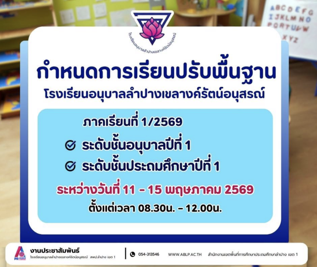 โรงเรียนอนุบาลลำปางเขลางค์รัตน์อนุสรณ์ ขอแจ้งประชาสัมพันธ์กำหนดการกิจกรรม “เรียนปรับพื้นฐาน” สำหรับนักเรียนใหม่ในระดับชั้นอนุบาลปีที่ ๑ และระดับชั้นประถมศึกษาปีที่ ๑ ประจำภาคเรียนที่ ๑ ปีการศึกษา ๒๕๖๙ เพื่อเตรียมความพร้อมและสร้างความคุ้นเคยให้กับนักเรียนก่อนเข้าสู่ระบบการเรียนรู้อย่างเต็มรูปแบบ โดยมีกำหนดการจัดกิจกรรมระหว่างวันที่ ๑๑ – ๑๕ พฤษภาคม ๒๕๖๙ ตั้งแต่เวลา ๐๘.๓๐ น. – ๑๒.๐๐ น.