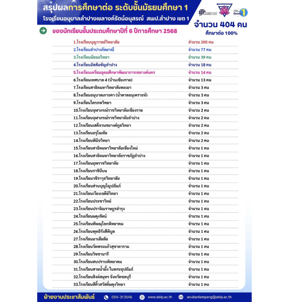 โรงเรียนอนุบาลลำปางเขลางค์รัตน์อนุสรณ์ ขอแสดงความยินดีและชื่นชมในความสำเร็จของนักเรียนชั้นประถมศึกษาปีที่ ๖ ประจำปีการศึกษา ๒๕๖๘ ที่สามารถสอบเข้าศึกษาต่อในระดับชั้นมัธยมศึกษาปีที่ ๑ ได้ครบทุกคน คิดเป็นร้อยละ ๑๐๐ ของจำนวนนักเรียนทั้งหมด ๔๐๔ คน โดยนักเรียนสามารถเข้าศึกษาต่อในโรงเรียนที่มีชื่อเสียงทั้งในจังหวัดและระดับภูมิภาค อาทิ โรงเรียนบุญวาทย์วิทยาลัย จำนวน ๒๐๕ คน, โรงเรียนลำปางกัลยาณี จำนวน ๗๗ คน, โรงเรียนมัธยมวิทยา จำนวน ๓๙ คน และสถานศึกษาชั้นนำอื่นๆ อีกหลายแห่ง